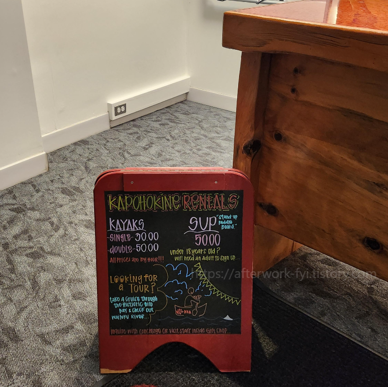 호텔 내부에는 체육관과 작은 수영장도 있었어요. 체육관에 있는 정수기에서 필요하면 물을 담으셔도 돼요. 체육관은 사람이 거의 없더라고요. 산책로도 잘 되어있었고요. 호텔 컨시어지에서 카약과 스탠드업 패들보트 그리고 캡틴쿡 가는 유료투어를 운영하고 있었어요. 저희는 가격을 보고 코나에서 카약을 빌리고 이곳에서는 빌리지 않았습니다. 가격을 훨씬 저렴하게 이용했던 후기는 이 블로그 글의 액티비티 소개 편을 참고하시면 됩니다.